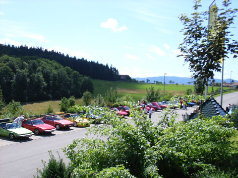 Für den Freitag ist eine Fahrt über die ehemalige Bergrennstrecke "Schauinsland" geplant. Es sind noch mehr X1/9 eingetroffen, der Treffpunkt für alle ist wieder der Leisenhof. Dort vertreiben sich die männlichen Mitglieder der Selbsthilfegruppe die Zeit beim lustigen Federball-Match!